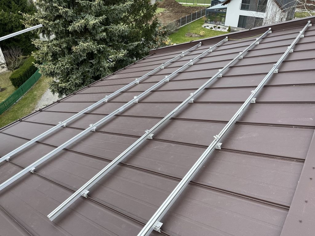 Univerzální konstrukce pro fotovoltaické panely na šikmou střechu pro 4 panely vhodná pro použití na falcovaný plech. Konstrukce je vhodná pro panely s rámem o tloušťce 30mm, 35mm, 40mm.